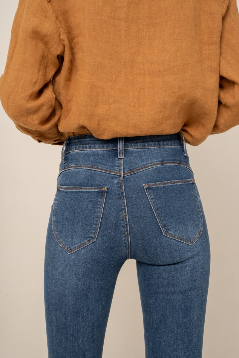 Amelie Jeans, a push up skinny designed with subtle details that will shape the silhouette when worn. Our skinny is the perfect everyday jean. We recommend wearing them with a slim, fitted top that is slightly tucked in to show off the waist and give a great silhouette.