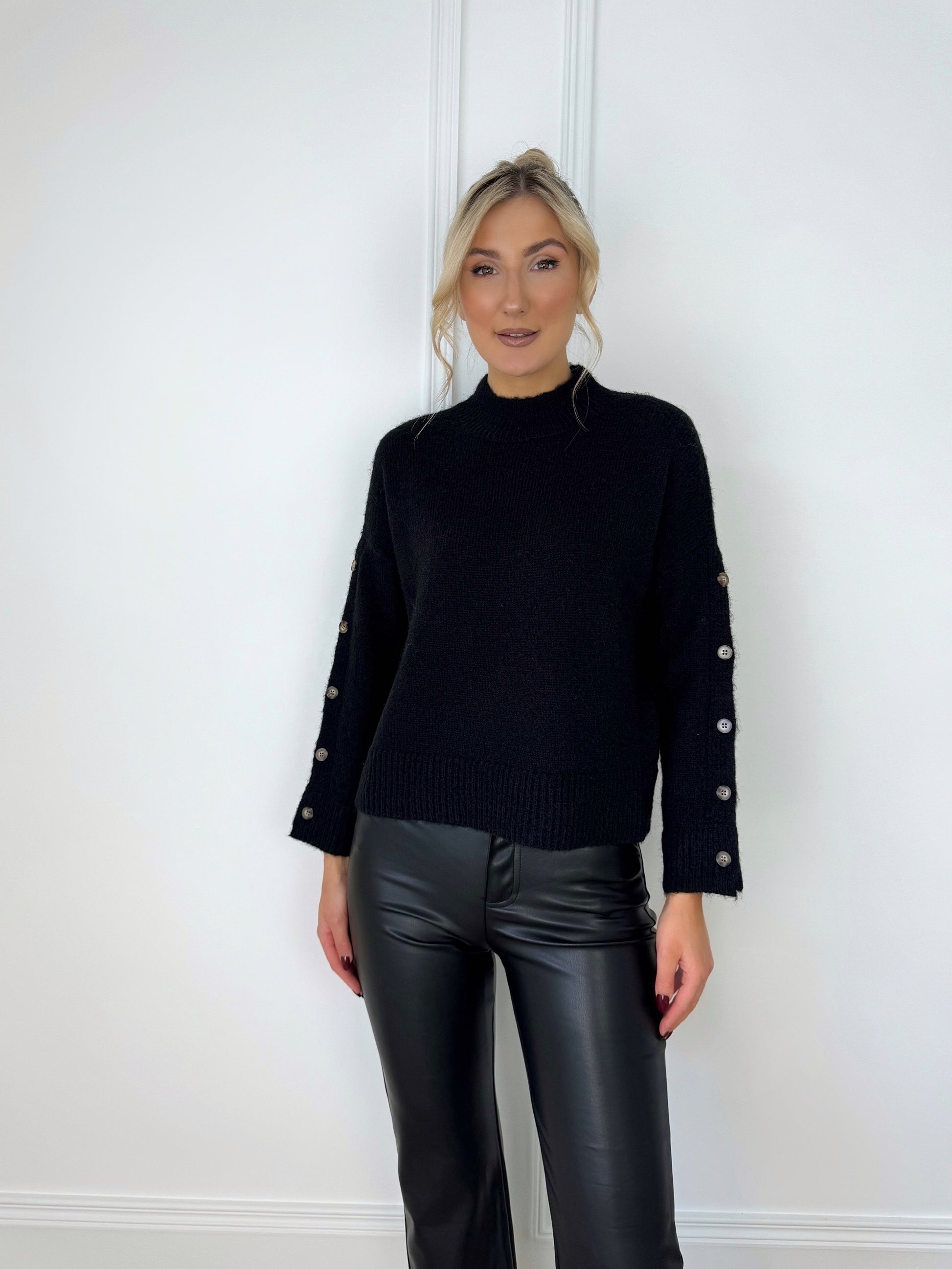 Round Neck Knit Jumper with Buttoned Sleeve - Black